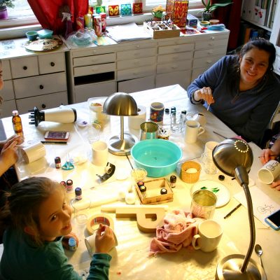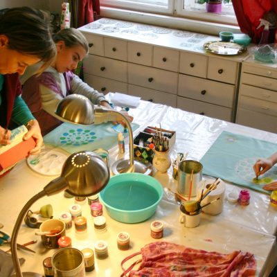 Ez jutott eszembe vasárnap, amikor az Alkotóműhelyemet totálisan átrendeztem, hogy mindenki kényelmesen dolgozhasson. Így volt külön porcelánfestő-, textilfestő- és üvegfestő asztal.