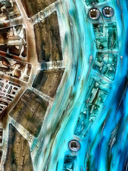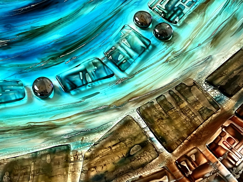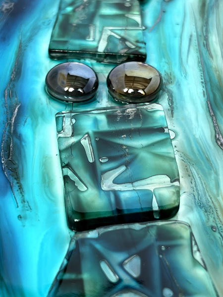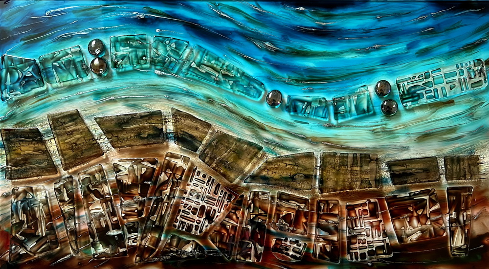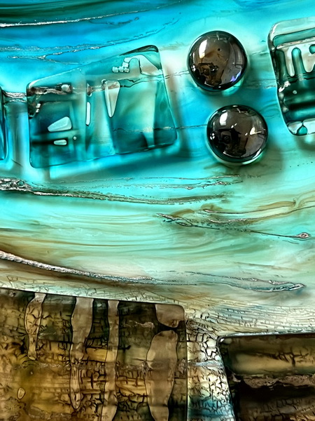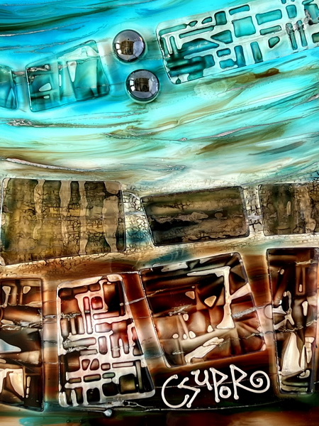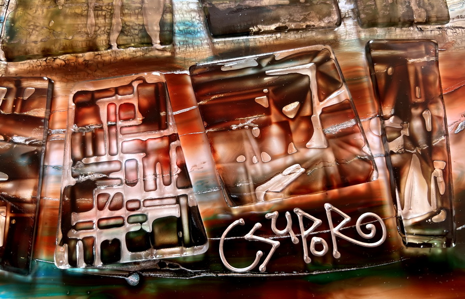 Mindkét oldalán festett üveg melyre üvegdarabok és –cseppek is kerültek.