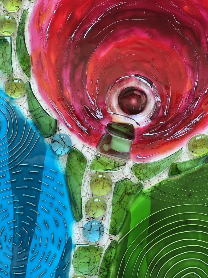Mindkét oldalán festett üveg melyre üvegdarabok és –cseppek is kerültek.